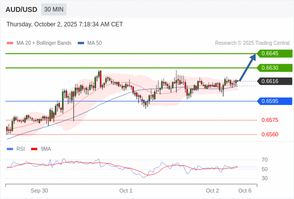在 0.6595 之上,看涨,目标价位为 0.6630 ,然后为 0.6645 。