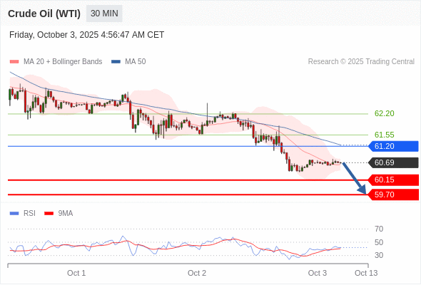 在 61.20 之下,看跌,目标价位为 60.15 ,然后为 59.70 。