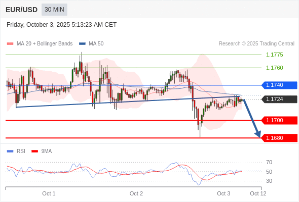 欧元/美元 当日内: 短期关键阻力位在1.1740。