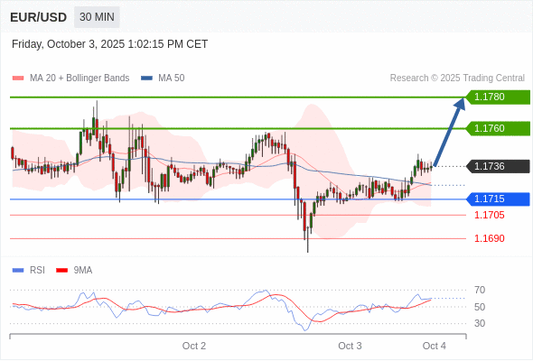 在 1.1715 之上,看涨,目标价位为 1.1760 ,然后为 1.1780 。