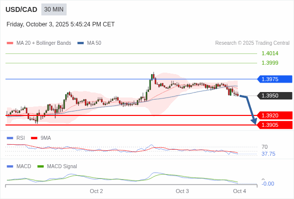 美元/加元 当日内 : 看跌,在 1.3975 之下。