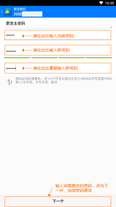 3.分别在当前密码、新主密码、密码确认框输入对应密码,然后点击底部[下一步]进行提交修改。