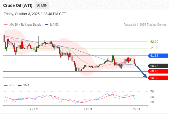 在 61.35 之下,看跌,目标价位为 60.40 ,然后为 60.00 。